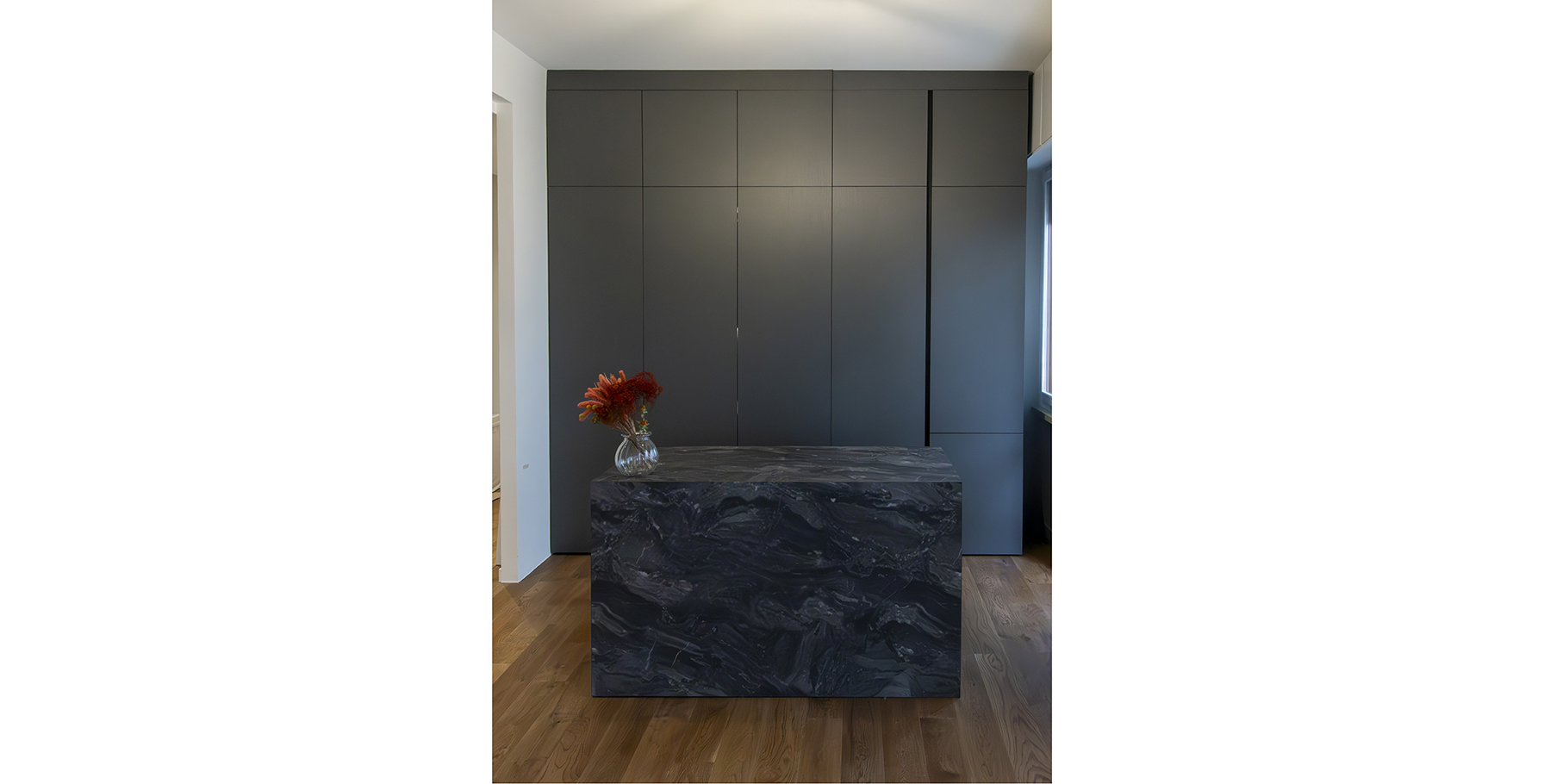 La scelta del grigio scuro opaco aggiunge profondità e carattere al progetto. La finitura soft-touch, oltre a garantire una piacevole sensazione al tatto, contribuisce a rendere la cucina un elemento d’arredo sofisticato e contemporaneo, facile da inserire in contesti sia moderni che più classici.