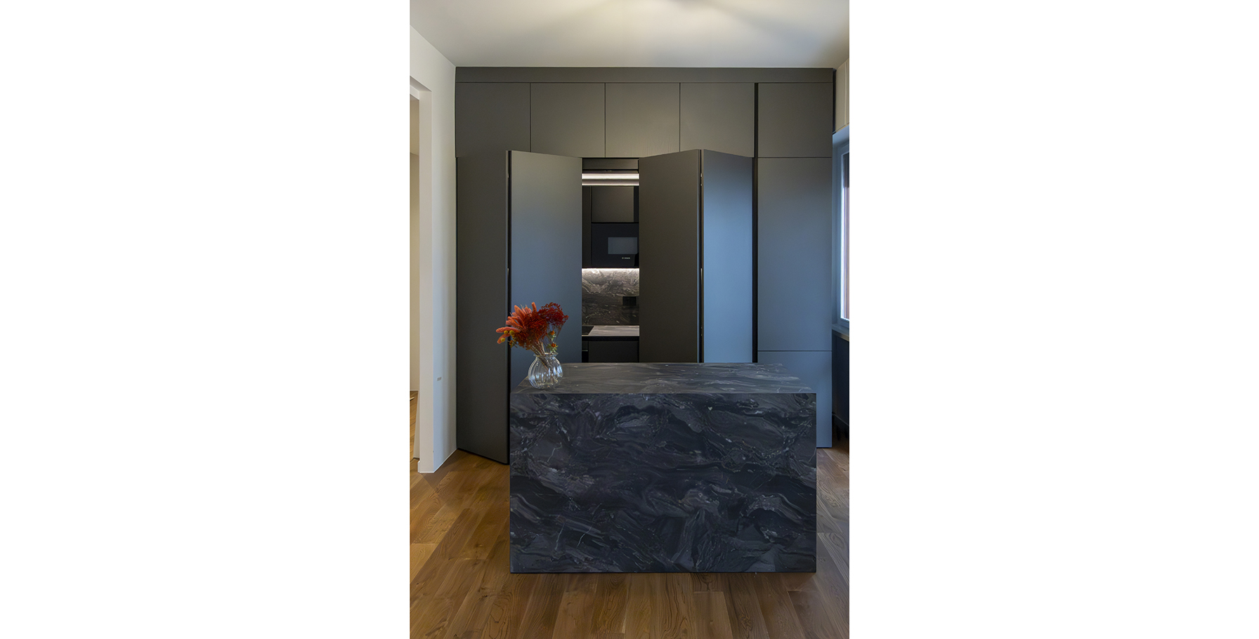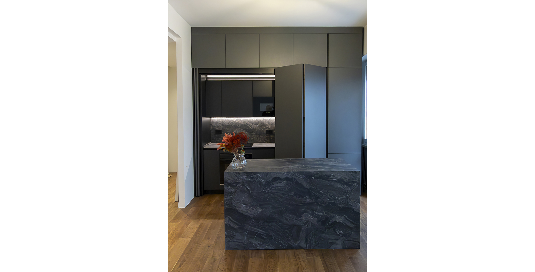 La funzionalità è valorizzata dalla presenza di pratiche ante rientranti che, una volta aperte, scorrono all’interno del mobile permettendo l’accesso completo alle aree operative. Una volta chiuse, l’intera cucina si mimetizza dietro una superficie uniforme, trasformando l’ambiente in un elegante volume monolitico.