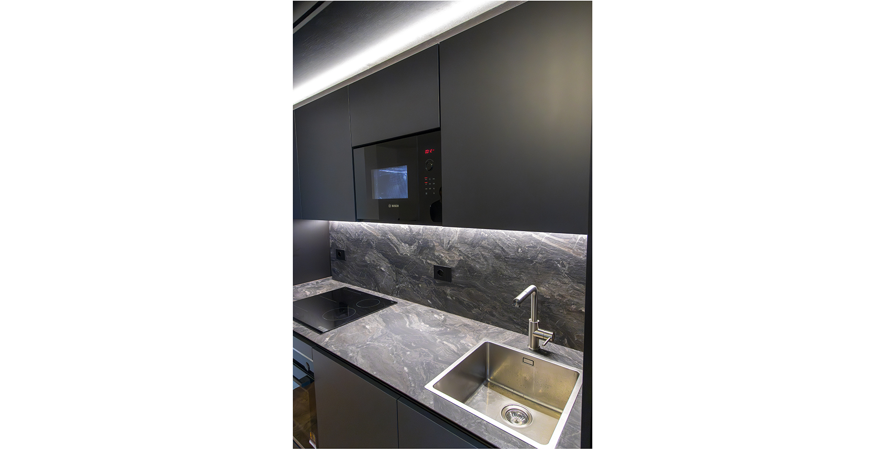 Il piano di lavoro è caratterizzato da una finitura effetto marmo che unisce eleganza e resistenza. Questa stessa finitura viene ripresa nei pannelli posizionati tra base e pensile, creando un forte richiamo visivo e un effetto scenografico di grande impatto. Oltre al valore estetico, il materiale assicura massima praticità d’uso, risultando facile da pulire e ideale per un utilizzo quotidiano intensivo.
